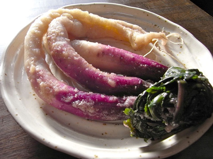 この時期旬の日の菜大根のふすま漬。ちょっとした苦みとクセのある味が特徴です。