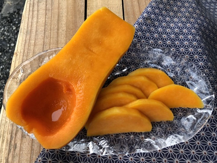 生のままでも食べられるバターナッツカボチャを浅漬けにしました。鮮やかなオレンジ色とほのかな甘みが特徴です。